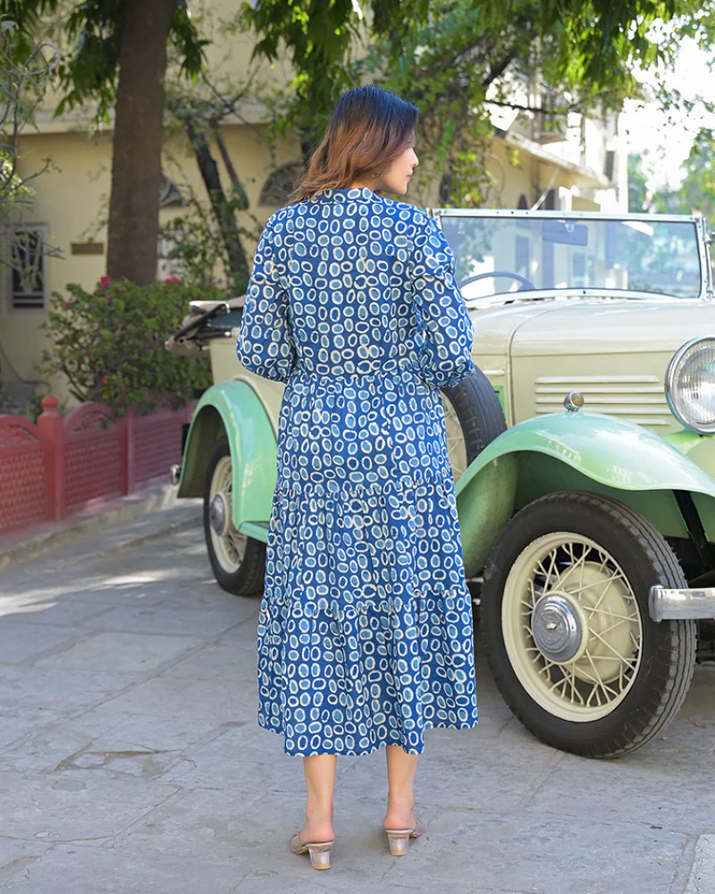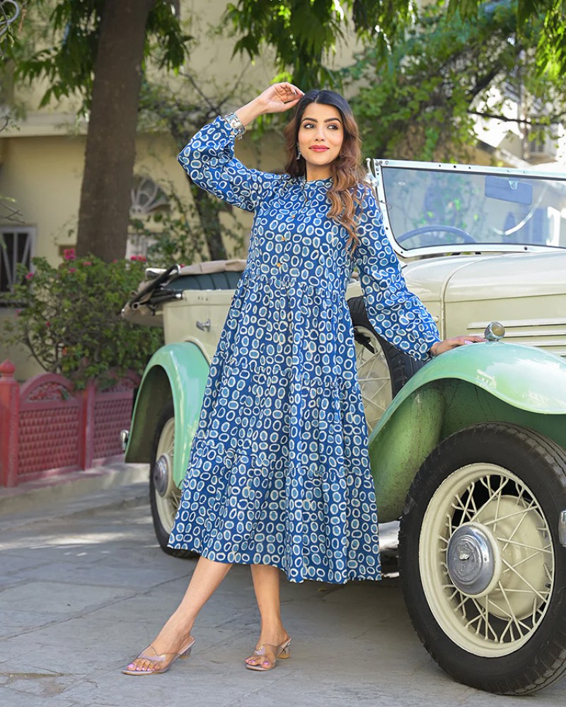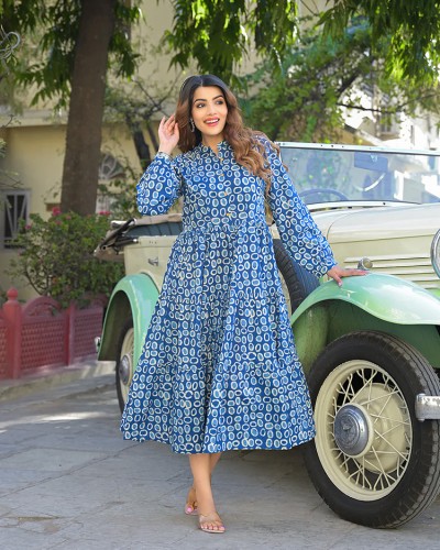 Divena Blue Floral Print Cotton Fabric Fit & Flared Dress