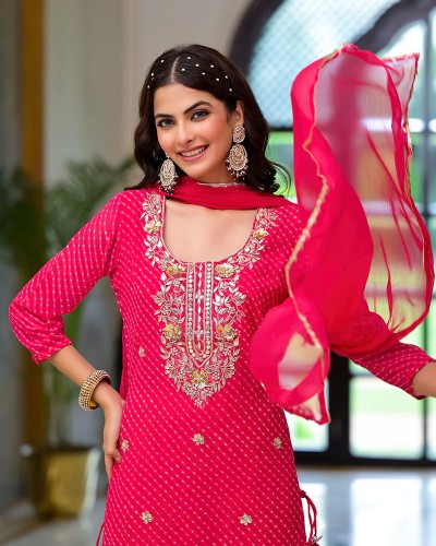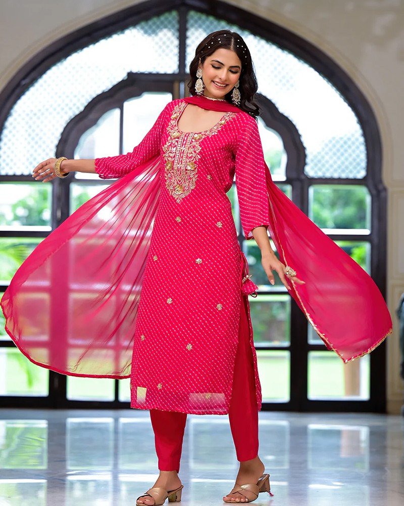 Divena's Pink Leheriya Print Georgette Fabric Straight Kurta & Trouser with Dupatta