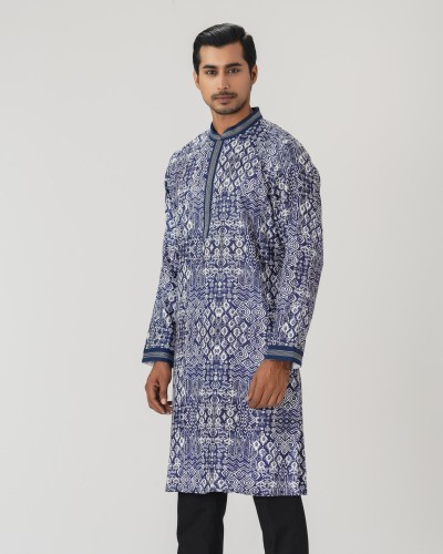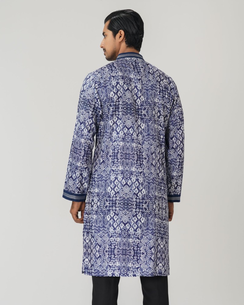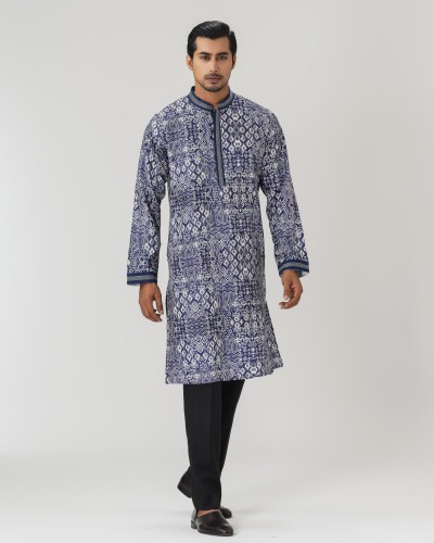 A regular-fit Panjabi crafted from 100% Tencel fabric, featuring classical allover discharge print with decorative buttons, offers a stylish yet comfortable daily-wear look. Perfect for